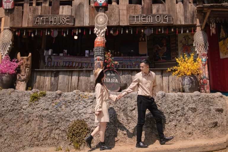 Trên con đường này bạn sẽ được đi qua một quán cafe Sapa đẹp nhất thị trấn. Đường này khá dốc và ở độ cao lớn hơn so với bản Cát Cát nên bạn sẽ được ngắm nhìn toàn bộ bản làng từ trên cao với những nếp nhà san sát nhau hòa nhập vào với cỏ cây hoa lá.