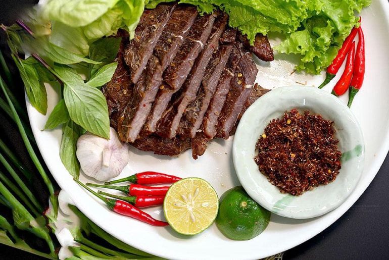 - Món bò một nắng là đặc sản không thể không nhắc đến khi ghé Phú Yên. Những con bò được chăn thả tự nhiên nên thịt bò rất chắc và dai nên khô bò khi làm ra có hương vị vô cùng thơm ngon. Người ta chọn phần thịt bò và bắp bò sau đó ướp với các gia vị như tỏi, ớt, tiêu sau đó đem phơi nắng. Phần khô bò dai dai thơm vị nắng và cay cay sẽ in đậm trong tâm trí người thưởng thức.